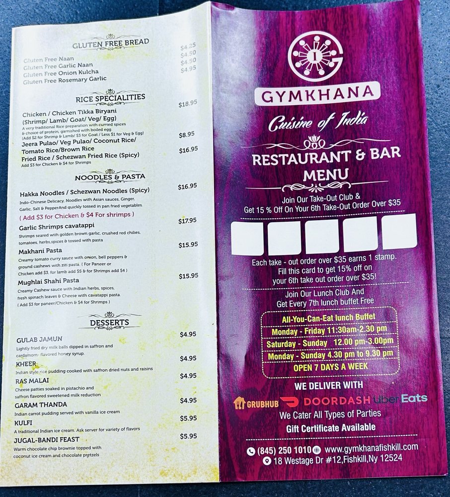 Welcome to Gymkhana Cuisine Of India, where traditional Indian flavors meet modern dining. Located in Fishkill, NY, this delightful eatery specializes in an extensive range of vegetarian, pescatarian, and vegan options, ensuring everyone finds a dish to love. The menu highlights include tender Chicken Biryani, savory Chili Paneer, and the must-try Cheese Dosa. Each dish is crafted with care, combining spices and herbs to create a symphony of flavors.